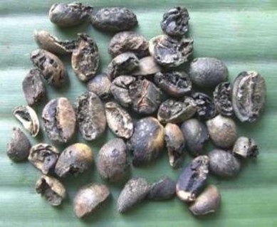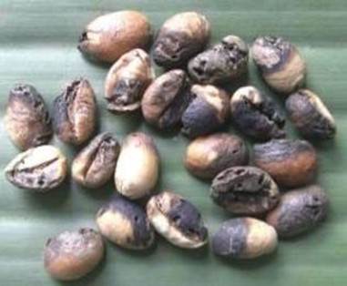 - buah kopi terserang hama penggerek buah kopi (Hypothenemus hampei) | - Bitterness tinggi - Aroma sangat kurang - Flavor Tarry - Acidity turun - Body sangat kurang - Flavor sangat kurang |